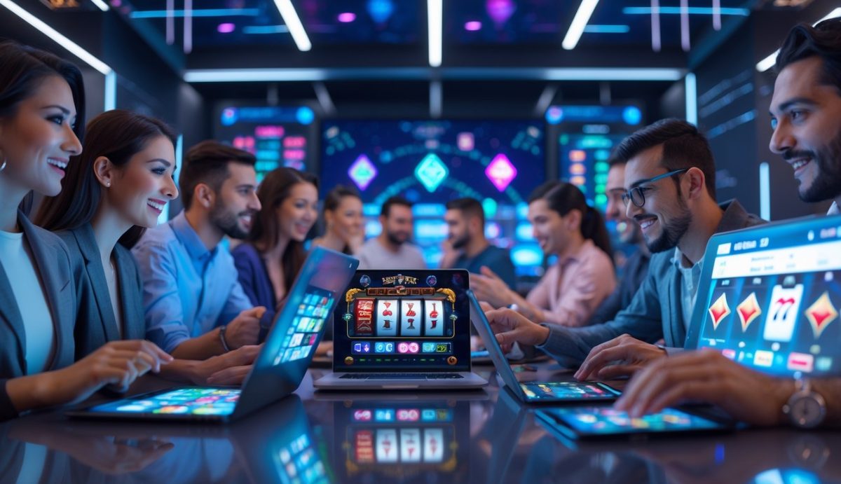 Sekelompok orang menggunakan berbagai perangkat digital untuk bermain game judi online di ruangan modern dengan pencahayaan terang.